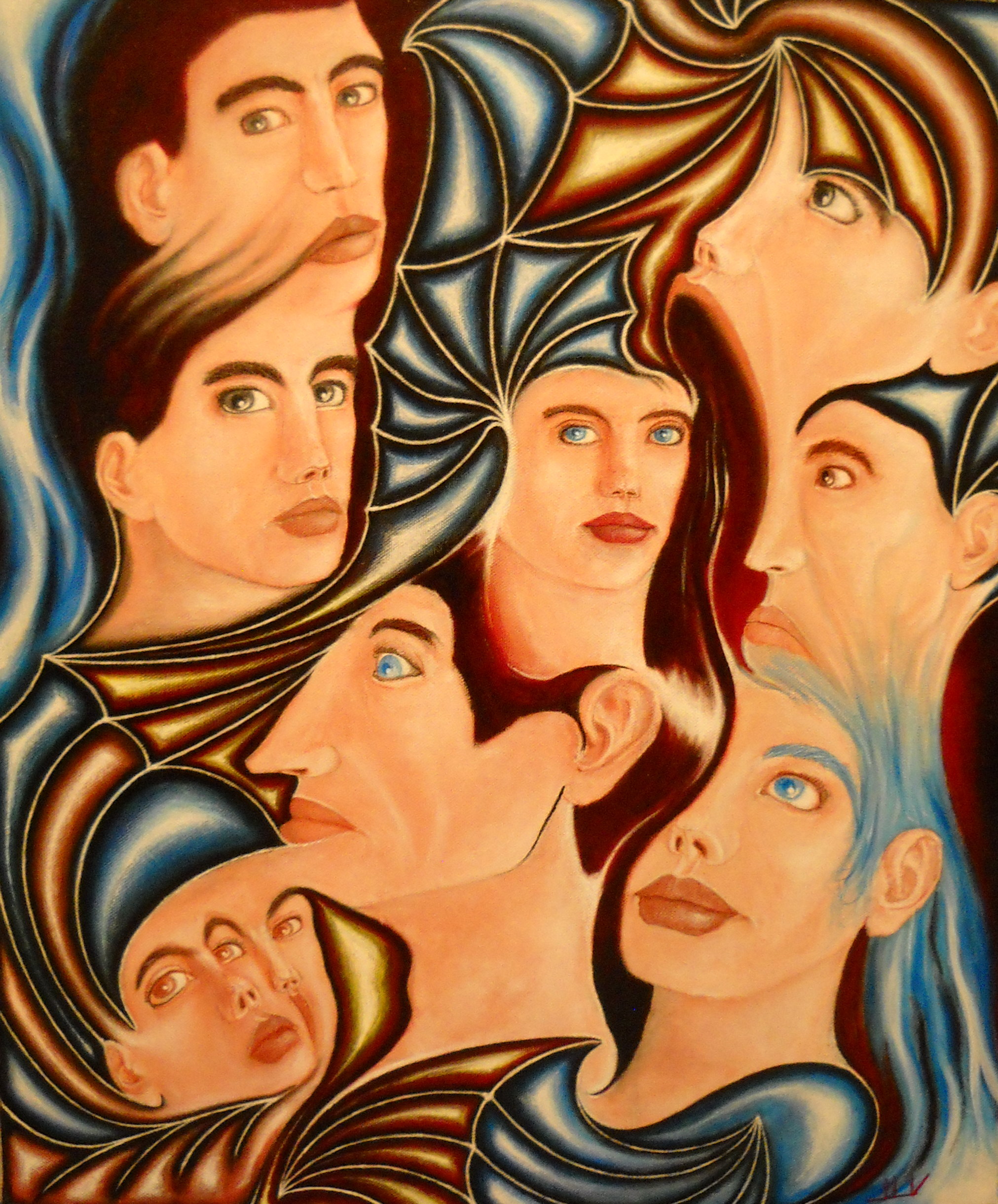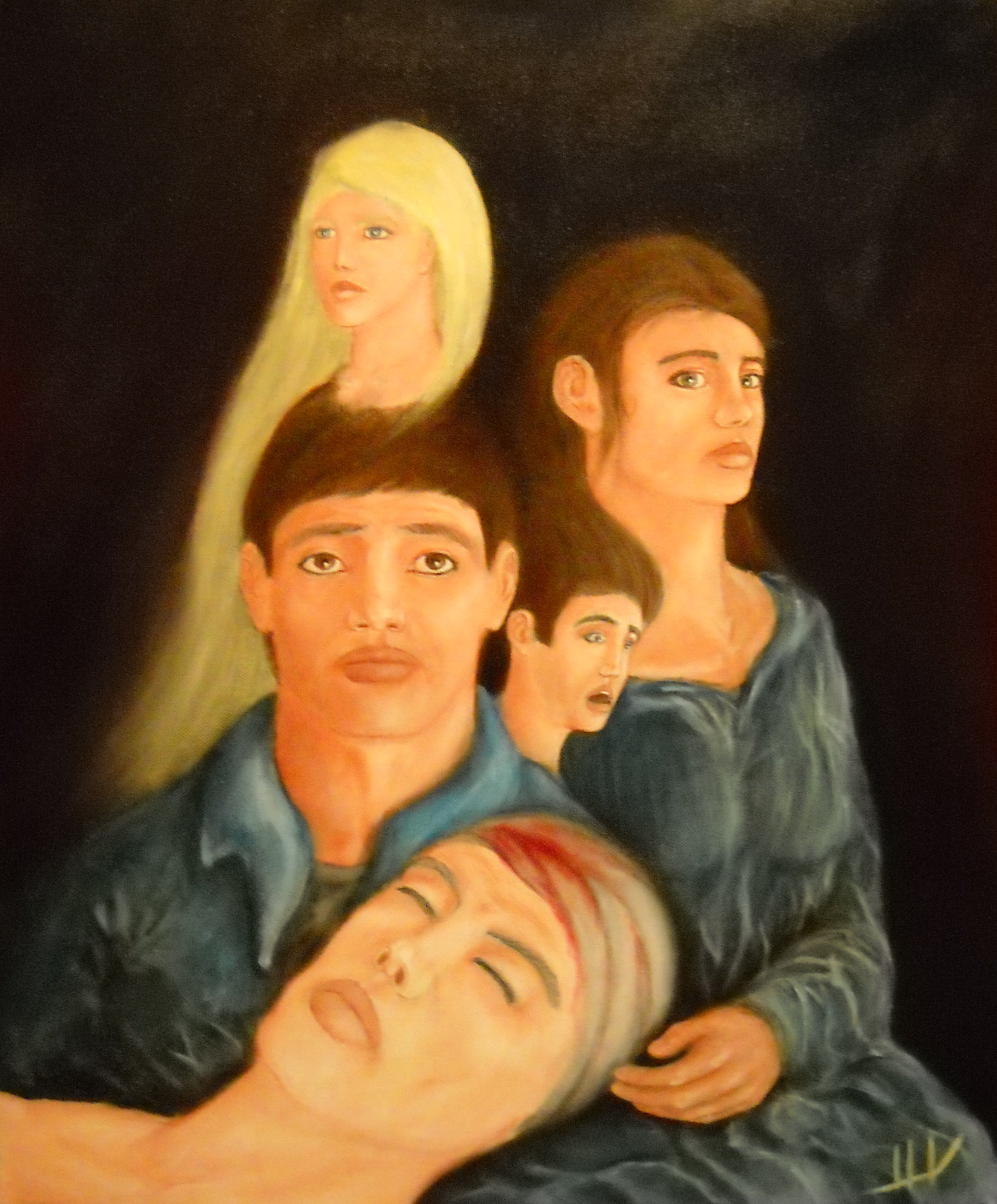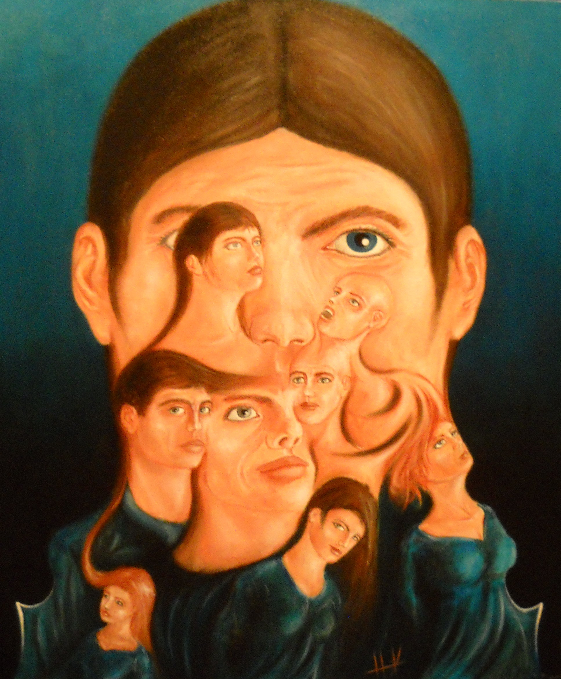 Plusieurs têtes et bustes, fond bleu/vert dégradé
